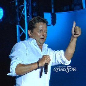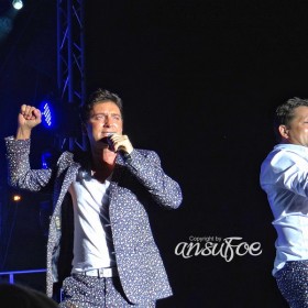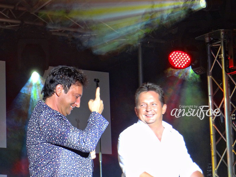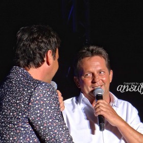 Nach einer dann doch etwas längeren (O-Ton Fredi) “Pippi-Pause, weil wir ja alle nicht mehr die Jüngsten sind”, ging es dann weiter im Programm. Aber wie. Bereits nach dem ersten Song stand der Moderator Erich Fuchs schon wieder auf der Bühne, begleitet vom Manager Andi Ferber und einem Vertreter der Plattenfirma, und sie brachten – völlig überraschend für die meisten im Publikum und auch für Fredi und Martin selbst – Gold. Gold für die DVD “Eine Nacht im Paradies – Mit Fantasy am Zuckerhut”. Das gab eine Freude. Als Dank performten die Beiden aus dem Stand “R.I.O. – Es geht nach Rio de Janeiro”. Und hier merkt man dann einfach, wer singen kann.