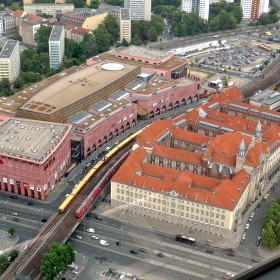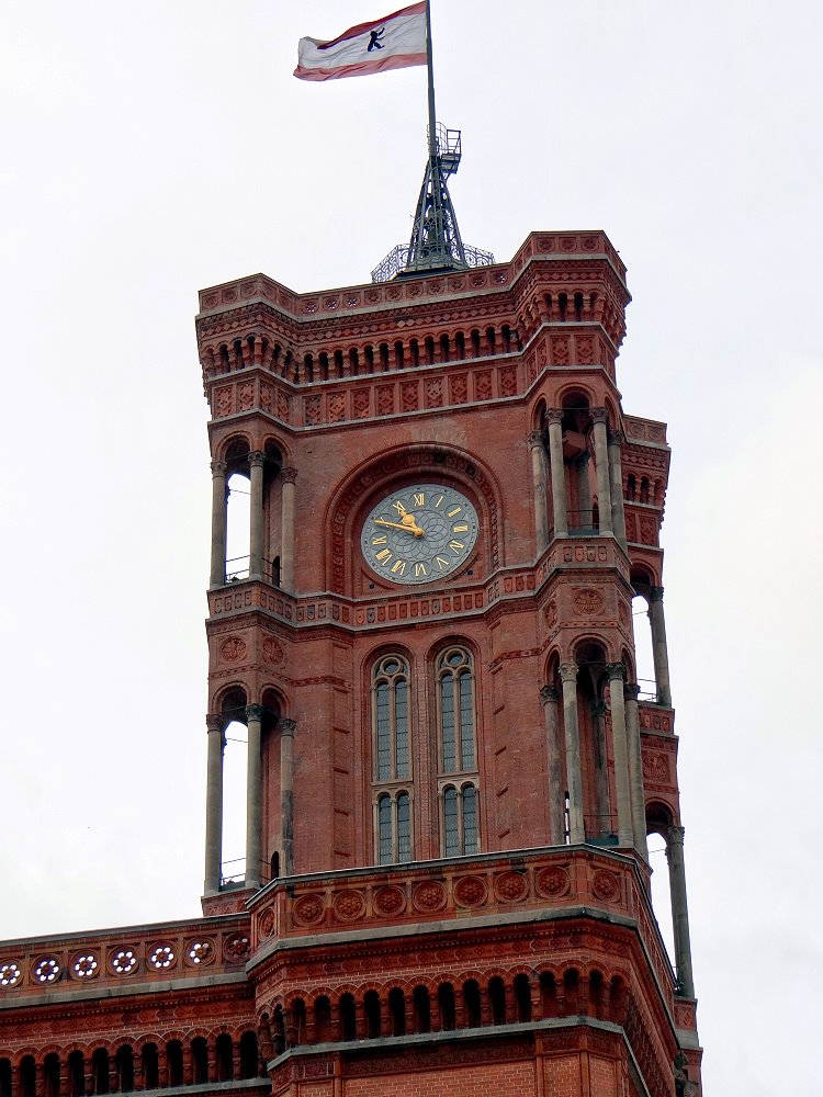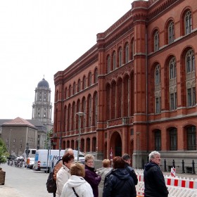 Weiter ging es unter der Bahnbrücke hindurch am Fernsehturm vorbei zum Roten Rathaus. Dort ist Großbaustelle, weshalb Fotografieren schlecht war. Aber ein paar brauchbare Fotos gibt es doch.