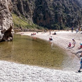 Wenn man nun den Weg ein wenig weiter ging und zwei schmale Tunnel passierte, kam man zur nächsten Schlucht, nämlich der, wo der Torrent de Pareis (ein Sturzbach) ins Meer mündet. Durch die Brandung ist aber der Kies zu sehr aufgeschüttet, so dass es zwischen Bach und Meer ein recht großes Stück trockene Kiesfläche gibt, die als Strand genutzt wird. Mir wäre es zu steinig, aber wer das mag…